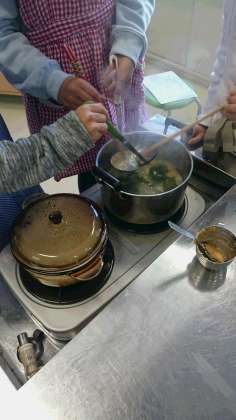 完成して待ちに待った試食です。この為に、朝ごはんを食べないできた子もいたようで(食べてきてくださいね!)、おいしそうに「朝ごはん」を食べていました。みそ汁の出汁を取るのに使った煮干しも、煮詰めてふりかけにして無駄にしません。今回の実習を生かして、ぜひお家でも作ってあげてほしいと思います。