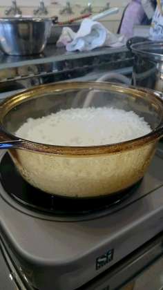 5年生が調理実習をしていました。今日の献立はごはんとみそ汁です。ごはんを炊くのには、中が見えるガラスの鍋を使います。水が沸騰して、米が水を含み、ぶくぶくとつぶを出し、段々とごはんが炊き上がっていく様子を見ることができました。