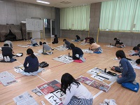 3年生 初めての書き初め 公開日 2019/12/11 更新日 2019/12/11 できごと 2年生までは硬筆で書き初めをしていました。今年からは毛筆で書き初めをします。小アリーナで書き初めの練習をしました。いつもは机の上の半紙に向かって書きますが、今回は床に座り、長い書き初め用紙に向かいました。息遣いしか聞こえないほどの静けさの中、真剣な眼差しで書き初め用紙と正対し、お手本を参考に「つよい子」と書きました。 1月には、体育館で書き初め大会をします。 いいね(0)