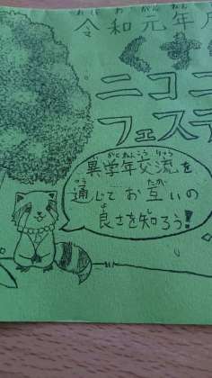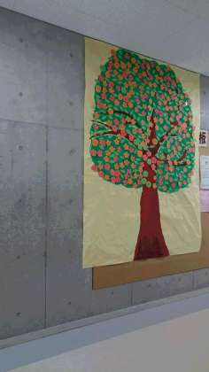 これは、くすのきニコニコフェスティバル(以下、くすがニコ)のしおりについていた「異学年交流について一言感想」を切って集めたものを、代表委員会が木に貼り付けたものです。くすニコでは、お店作りやフェスティバル全体を通して、「異学年交流を通じてお互いの良さを知ろう!」をめあてに取り組んできました。