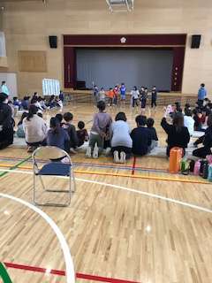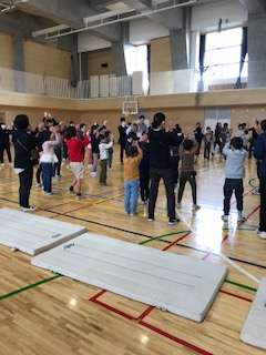 松沢小くすのき学級は、ダンスの担当でした。ダンスは、ジンギスカンです。初めに、5年生と6年生がみんなの前で、振り付けのお手本を見せてくれました。その後、4校の友達と一緒に踊りました。