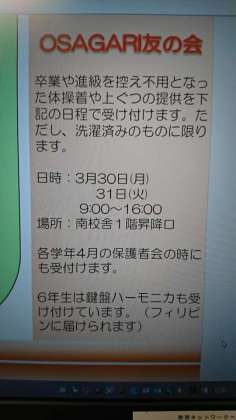 昨日から、学校運営委員会「OSAGARI友の会」で、「上ばき」「体育着」「鍵盤ハーモニカ」等の提供を受け付けています。場所は、南校舎1階昇降口入ってすぐの事務室前です。不用になったものがありましたら、ぜひ御協力ください。