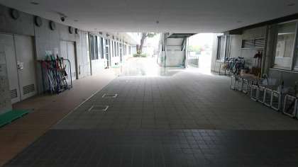 引き取りは、写真2枚目のピロティ(屋外)に机を出して、ウォークスルー方式で行います。