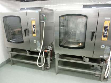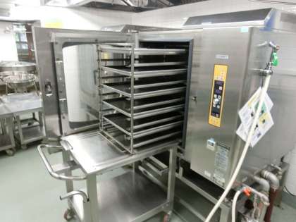 トレーは いちどに だしいれします。まつざわしょうがっこうでは トレーが10まい はいる スチコン 2だいが フルかいてんして きゅうしょくを つくります。