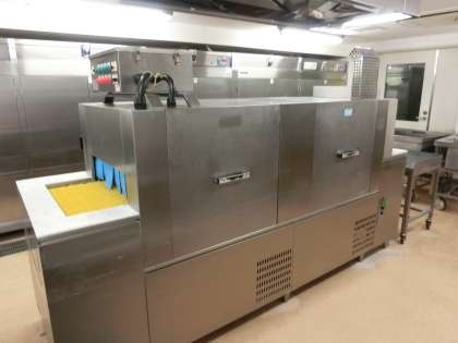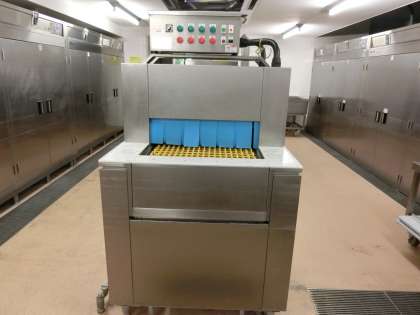 まつざわしょうがっこうでは、しょっきを せっけんで てあらいし、すすぎの ときに せんじょうきを つかいます。しゃしんの はんたいがわから しょっきを いれると、きかいの なかで すすがれて こちらがわに でてきます。