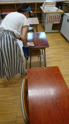 さて、児童が去った教室では早速消毒の作業です。子供たちの机や触った場所を丁寧に拭いていきます。次に来る子たちが安心して来られるように。
