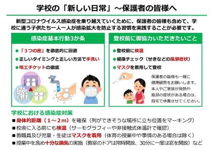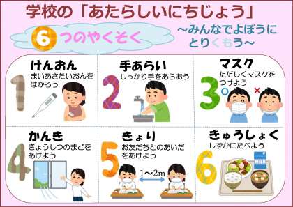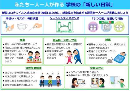 子供たち一人一人が感染拡大を防止する習慣を実践し、新型コロナウイルス感染症を乗り越えていけるように学校で取り組んでいきます。引き続き、保護者の皆様のご協力をよろしくお願いいたします。