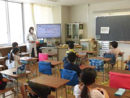 担任の自己紹介に興味を示して聞き入る様子から、新しい学級への期待やがんばろうという気持ちが感じられました。養護教諭による保健指導もありました。今回は、感染症の予防について、分散登校でも改めて気を付けていくことの話がありました。