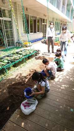 裏庭で3年生が今日持ってきた鉢に土を入れていました。何を植えるのか聞いてみると、ホウセンカを植えるのだと教えてくれました。