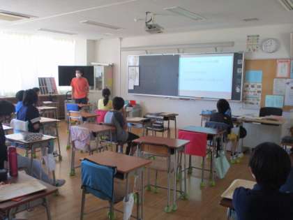 2組では、先週子供たちから預かった自己紹介カードについて、スライドを使って話をしていました。