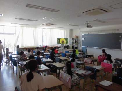 4年生が元気に登校しました。理科「春の生き物」の授業をしていました。大きな画面に映った春の生き物に興味津々で、とても楽しそうな様子で学んでいました。