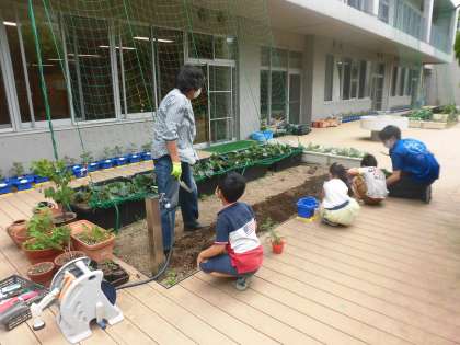 生活科:ミニトマトの苗を植えました。苗植えの後は心を込めて水やりをしていました。