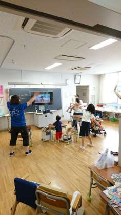 きはだ学級は個別の学習に取り組んでいるところでした。別の教室では、大きな画面の映像を見ながら真似をして体操していました。