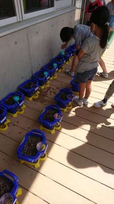 1年生が、先日種を植えたあさがおの鉢に水をあげていました。まだ芽は出ていません。3年生のホウセンカも早く芽が出ていたので1年生のあさがおも早く芽が出てくるでしょうか。楽しみですね。それぞれのクラスのベランダで育てています。1組だけベランダがないので、くすのき学級前の日当たりのいい場所に鉢を置いています。