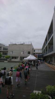 昨日は雨が降っていたので、登校してきた子たちがある程度集まったところで順次教室に入れていきました。今朝は登校時間には雨が止みましたので、初めてテープを目印に間隔をとって並んで入室を待ちました。とはいえ、児童数の多い松沢小学校です。この列の長さになります。様子を見て、少し早めに人数を区切りながら教室に入れていきました。これからしばらくの登校の形です。人数を分散させるため、登校時間を分けています。