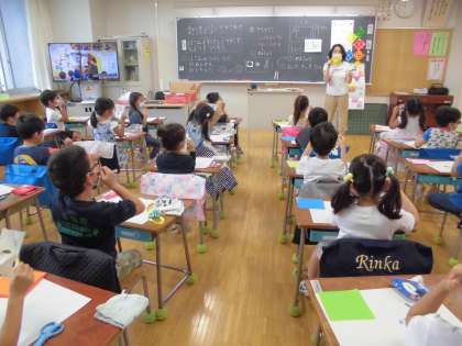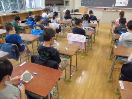 1−2の図工の授業をしている様子です。図工の、「チョッキンパでかざろう」でははさみの正しい使い方を学習しました。丸を切ったり、折り紙で三角形を折って切りとったりしてオリジナルの模様を作りました。