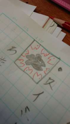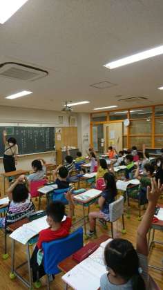 2年生が国語で「スイミー」の学習中。この時間は、1場面を読んで、スイミーがどんな魚かを読み取っていました。かわいいスイミーの絵も入れてノートに自分が読み取ったことを書き、発表していました。