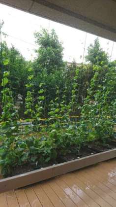 2年生の教室前のキュウリの蔓が伸びてきました。いいグリーンカーテンになりそうです。