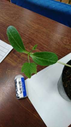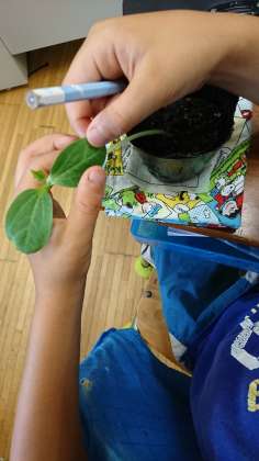 4年生がヘチマの観察をしていました。以前に紹介した光に向かって伸びるヘチマです。教室で様子を見ながら育てていたため、少しひょろりと伸びていますが、子葉(双葉)の間から、ギザギザの本葉が姿を現していました。そろそろ移植でしょうか。子葉や本葉の様子をよく見たり、触ったりして、観察できていました。