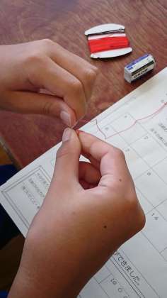 5年生が家庭科で裁縫の学習をしていました。今日は「玉結び」を練習していたようです。ちょうど3分間の「玉結び競争」が始まるところでした。