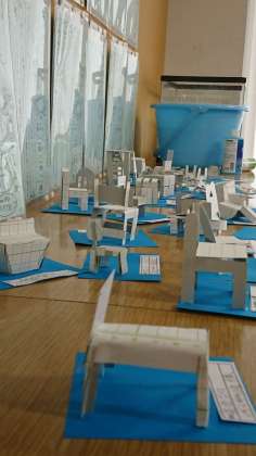後ろには、先日の図工出てくる作った「イス」が飾られていました。ずらりと並ぶと壮観です。