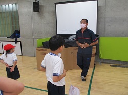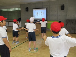 初めは身体をほぐしてから、音楽に合わせてラジオ体操をしました。そのあとは動画を見ながらのダンスタイム!おなじみの「チェッコリ」「エビカニクス」や、新しく取り入れた「EXたいそう」まで、お手本を真似ながら楽しく踊りました。踊ったあとの水分補給がまた一段と美味しそうに見えました。