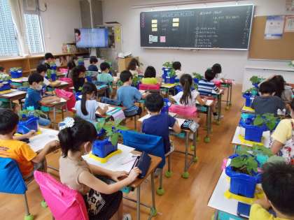 1組は、生活科であさがおの観察をしました。前に観察した双葉を探してから、今日観察する本葉を見ました。よく見たり、触ったりする中で、双葉と本葉の違いに気付きました。追肥をし、支柱も立てました。これからまた育っていくのが楽しみですね。