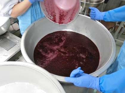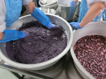 【2】は米粉と一緒に「あるもの」をまぜると、ブルーベリーの紫色が青っぽくなりました。さて、「あるもの」とは何でしょうか。