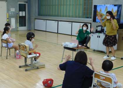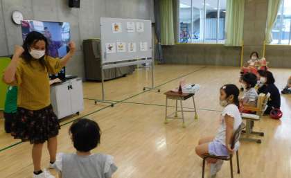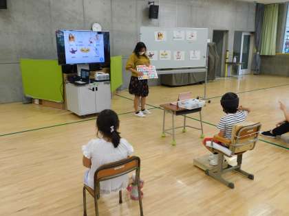 5時間目にALTの先生と小アリーナで外国語の活動をしました。初めのグリーティングでは、「My name is〜」や「I’m fine.」を元気いっぱいの声で発表しました。状態を表す英単語「great」「excellent」「good」などを当てるクイズでは、すすんで挙手をして活動を楽しみました。先生とのやりとりや歌、クイズなどを通して英語に触れ、英語に親しみました。