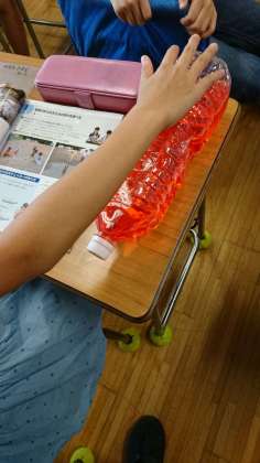 4年生が理科をしていました。色水の入ったペットボトルが見えます。何でしょう。気になったので入ってみると「雨水の流れ」の学習でした。ということは、これがあの「かたむきチェッカー」ですね!話には聞いていましたが、実物を見るのは初めてです。