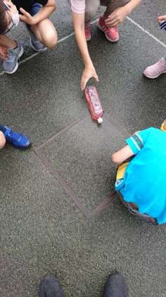 外に出て実際に地面の傾き調べるというのでついていってみました。水たまりはあるけど、雨は降っていないというベストコンディション!水たまりを探してチェッカーで調べていました。傾きがあり、そこに水が溜まっているのが分かりました。