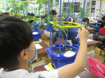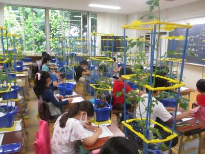 今日は、「実はどこについているのだろう」という視点で実の観察をしました。緑やオレンジ、赤など色も大きさもバラバラな実ですが、つるつるしていて今にもはじけそうな美味しそうなミニトマト!今勉強している「長さ」の学習を生かし、長さを記録する子もいました。これから真っ赤な実が次々とできることでしょう。