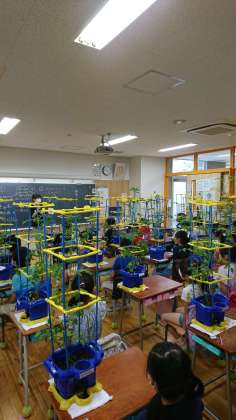 昨日の2年生です。教室でトマトの観察をしていました。これまでも、鉢を教室に運んで、それぞれの机で観察する様子を見ていましたが、支柱が立つとまた景色が変わります。教室中に、支柱が林立する様子は、ジャングルを思わせます。なかなかの光景です。