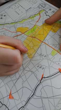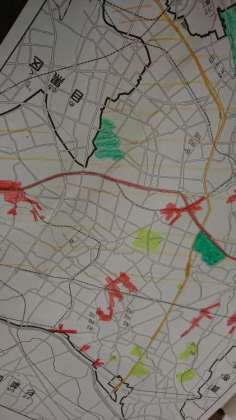 世田谷区の土地の使われ方で1番多いのは、圧倒的に住宅地です。1枚目の赤と緑と黄緑で塗られているところ以外の場所は、全て住宅地!そこを橙色で塗っていました。色分けをすると、一目で土地の使われ方の様子が分かりますね。皆、根気よく作業に取り組んでいました。