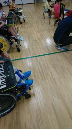 きはだ学級が、小アリーナで音楽の学習をしていました。この間見られなかった合奏の練習をしていました。