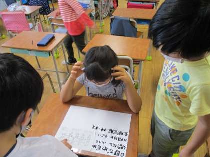 梅雨が続き、外遊びが十分にできない子供たちですが、休み時間は係の仕事に夢中です。写真の様子は、漢字係が出した難問クイズに挑戦しているところです。かなり難しい!!