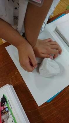 1年生が、図工で粘土を使っていました。今日は「いろいろなつくりかたをためしてみよう」ということで、丸くしたり、平らにしたりして粘土の扱いを色々と学んでいました。ドラゴンボール→ハンバーグ→パンケーキ、と順に形を変えていきました。