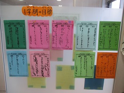 くすのき学級では、子供たちがそれぞれ「学習」「生活」「健康」の3つの目標を立てて過ごしました。目標に対して頑張ったことや、もう少し頑張りたいことを振り返り、ワークシートに書きました。「一番頑張ったこと・楽しかったこと」の項目では、「個別学習の時間をいつも頑張った」「新聞をビリビリにした遊びが楽しかった」など、思い思いに書いていました。