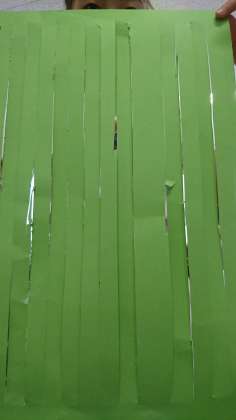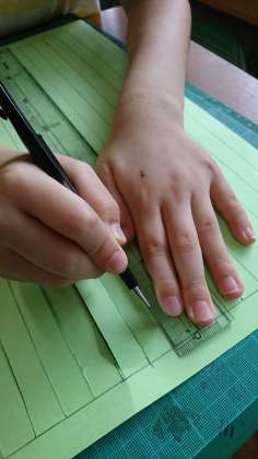 4年生が、図工「かみをあんでみよう」の続きに取り組んでいました。前回、線を引いて、縦に切り込みを入れる準備をしていましたが、今回はカッターで縦の切り込みを入れて、横に紙を編み込んでいきます。