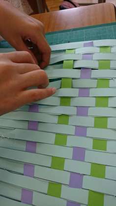 土台の色との相性を考えながら、横に編み込む紙の色を決めていきます。並べてみて首をひねり、色を変えてまた並べ・・・きれいな色の並びができていました。