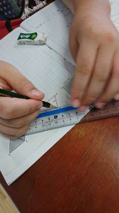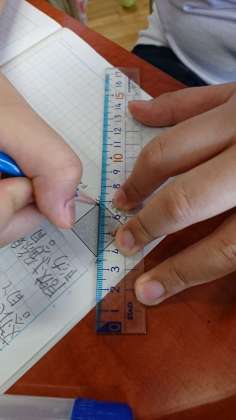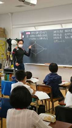 5年生の算数は「合同な図形」の学習です。これまで「合同」の定義を知り、色々な種類の図形の合同や対応する辺、角、頂点について学習してきました。今日は、四角形に対角線を引いてできた図形について考えていました。