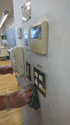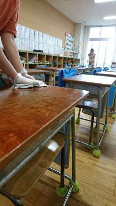 ガイドラインに従い、毎日児童下校後に教室の消毒を行っています。各トイレは、主事による消毒を日中に3回実施しています。週末の金曜日は、特に念入りにすみずみまで行います。今は、児童による清掃を行っていないため、あわせて教室の清掃もこの時間に行っています。