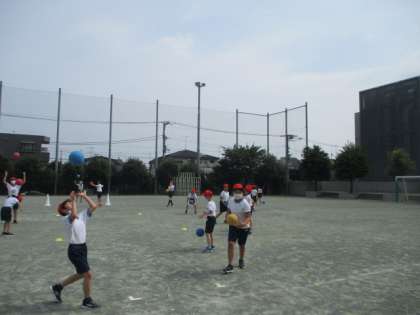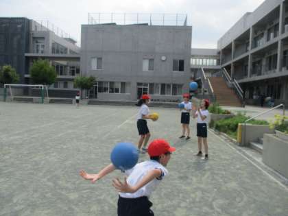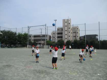 5年生、体育の学習では、球技の練習のため一人一人ボールを使って体を動かしました。
