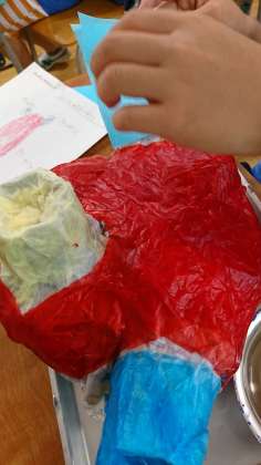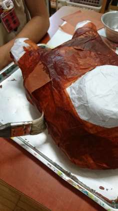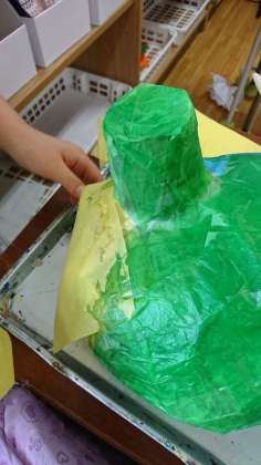 2年生の図工「かぶってへんしん」は、前回新聞紙で作ったベースに、きれいな薄い色紙を貼り付けているところでした。色が付くと、だんだん何の動物か、はっきりしてきました(動物ではないものもあります)。大きな面は、迫力があります。もう一息で完成でしょうか。完成が楽しみです。