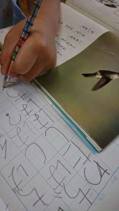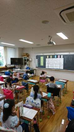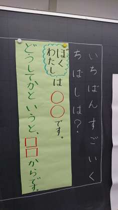 1年生は、国語「くちばし」で、色々な鳥のくちばしの形やはたらきを読み取ってきました。今日はその中で「自分が」一番すごいと思ったくちばし(鳥)を選び、理由とともに文章に表す学習をしていました。初めてなので、お手本になる文が示されています。この型に当てはめて考えていました。