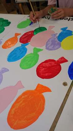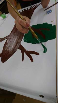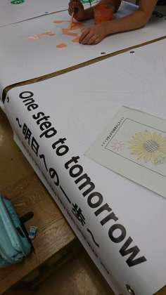 今年は、サマーフェスティバルもない下高井戸の街を、子供たちの絵で明るくしてほしい!という願いから、下高井戸商店街振興組合さんとのコラボで始まった今回の企画です。フラッグだけではなく、筆とアクリル絵の具もご用意いただきました。そして届いたフラッグのなんと立派なこと!その大きなキャンバスに、思いきりよく絵を描いていました。完成が楽しみです!