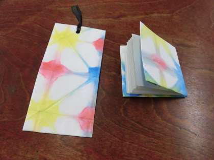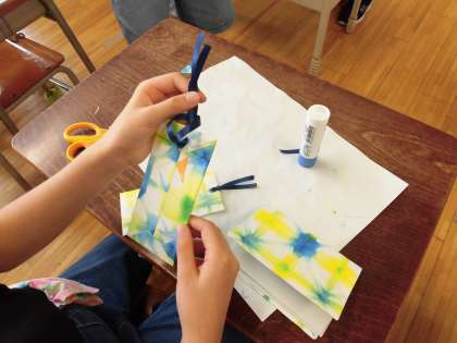 3年生の図工の学習では、先週作った和紙の染め紙を生かして、しおりやミニノート作りをしました。友達と和紙の切れ端を交換して自分のしおりにアレンジして貼り付けるなど、すてきに仕上げました。