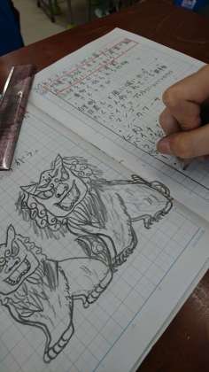 ノートに、皆シーサーの絵を描いてあります。何を見て描いたのか分かりませんが、とても上手で驚きました。