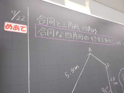 などの声が聞こえてきました。昨日習った、合同な三角形の描き方を参考に考えることができていて素晴らしかったです。
