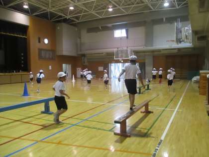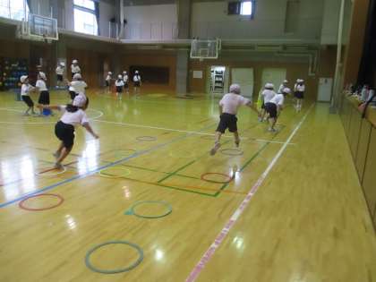 1週間に1回のみの体育館体育授業。天候にかかわらず、必ず授業ができるので、子供達は毎週楽しみにしています。1組は1校時の授業ということで、朝の短い時間に着がえをします。チャイムで授業が開始できるように、みんな時間を守って着がえています。